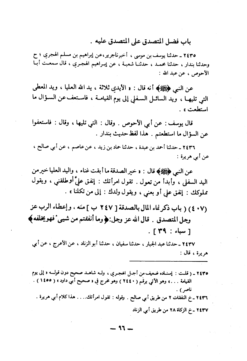 2437 - حَدَّثَنَا عَبْدُ الْجَبَّارِ، حَدَّثَنَا سُفْيَانُ، حَدَّثَنَا أَبُو الزِّنَادِ، عَنِ الْأَعْرَجِ، عَنْ أَبِي هُرَيْرَةَ قَالَ: قَالَ النَّبِيُّ صَلَّى اللهُ عَلَيْهِ وَسَلَّمَ: " §مَثَلُ الْمُنْفِقِ وَالْبَخِيلِ، كَمَثَلِ رَجُلَيْنِ عَلَيْهِمَا جُبَّتَانِ مِنْ حَدِيدٍ مِنْ لَدُنْ ثَدْيَيْهِمَا إِلَى تَرَاقِيهِمَا، فَإِذَا أَرَادَ الْمُتَصَدِّقُ، وَالْمُنْفِقُ أَنْ يُنْفِقَ أُسْبِغَتْ عَلَيْهِ الدِّرْعُ أَوْ وُفِّرَتْ حَتَّى تَقَعَ عَلَى بَنَانِهِ وَتَعْفُو أَثَرَهُ، وَإِذَا أَرَادَ الْبَخِيلُ أَنْ يُنْفِقَ قَلَصَتْ وَأَخَذَتْ كُلُّ حَلْقَةٍ مَوْضِعَهَا حَتَّى أَخَذَتْ بِتَرْقُوَتِهِ أَوْ بِعُنُقِهِ، فَقَالَ أَبُو هُرَيْرَةَ: أَشْهَدُ عَلَى رَسُولِ اللَّهِ صَلَّى اللهُ عَلَيْهِ وَسَلَّمَ أَنِّي رَأَيْتُهُ يَقُولُ بِيَدِهِ وَهُوَ يُوَسِّعُهَا وَلَا تَتَّسِعُ