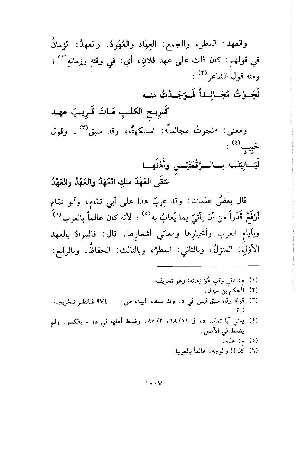 قال بعض علمائنا: وقد عيب هذا على أبي تمام، وأبو تمام أرفع قدرا من أن يأتي بما يعاب به، لأنه كان عالما بالعرب وبأيام العرب وأخبارها ومعاني أشعارها. قال: فالمراد بالعهد الأول: المنزل، وبالثاني: المطر، وبالثالث: الحفاظ، وبالرابع: