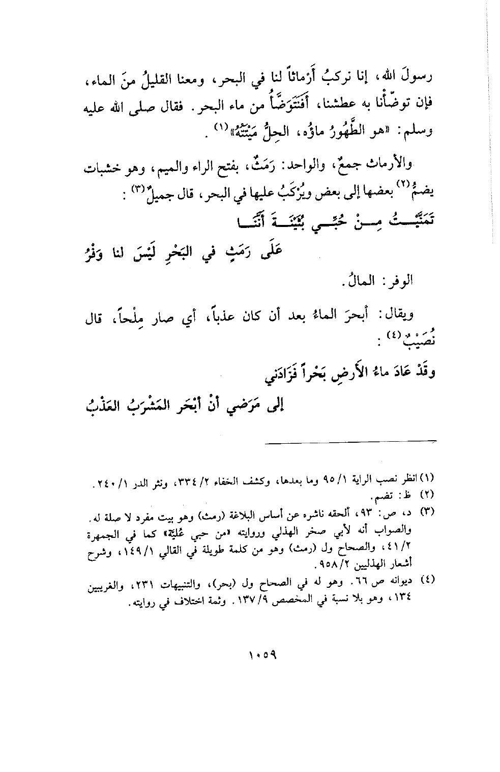 رسول الله، إنا نركب أرماثا لنا في البحر، ومعنا القليل من الماء، فإن توضأنا به عطشنا، أفنتوضأ من ماء البحر. فقال - صلى الله عليه وسلم -: (هو الطهور ماؤه، الحل ميتته).