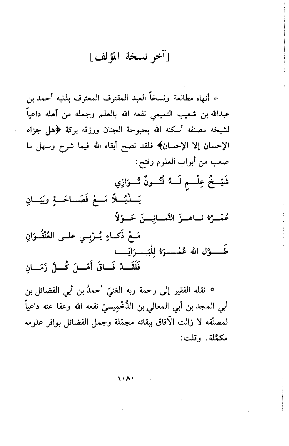 أنهاه مطالعة ونسخا العبد المقترف المعترف بذنبه أحمد بن عبد الله بن شعيب التميمي نفعه الله بالعلم وجعله من أهله داعيا لشيخه مصنفه أسكنه الله بحبوحة الجنان ورزقه بركة {هل جزاء الإحسان إلا الإحسان} فلقد نصح أبقاه الله فيما شرح وسهل ما صعب من أبواب العلوم وفتح: