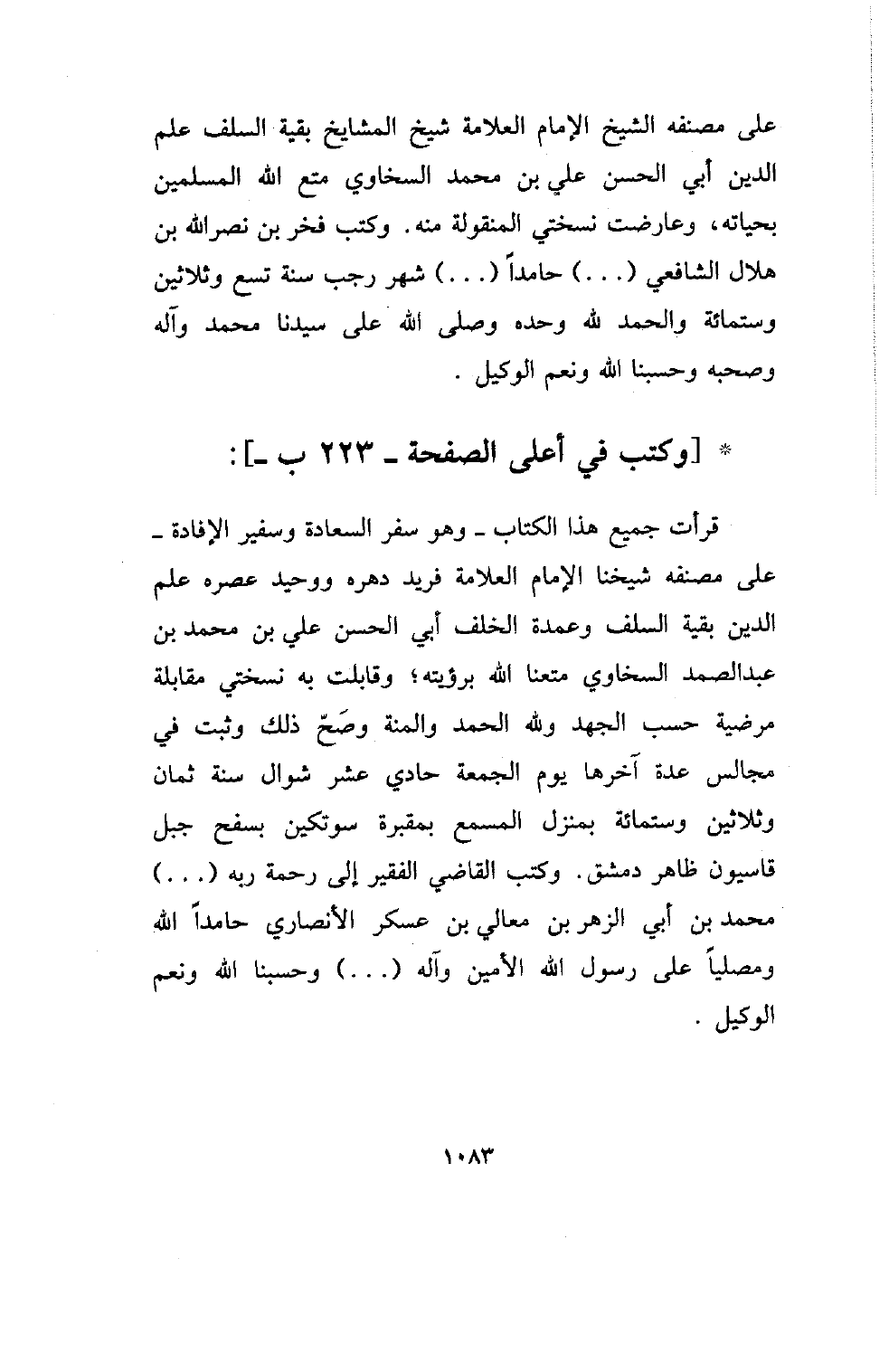 على مصنفه الشيخ الإمام العلامة شيخ المشايخ بقية السلف علم الدين أبي الحسن علي بن محمد السخاوي متع الله المسلمين بحياته، وعارضت نسختي المنقولة منه. وكتب فخر بن نصر الله بن هلال الشافعي (...) حامدا (...) شهر رجب سنة تسع وثلاثين وستمائة والحمد لله وحده وصلى الله على سيدنا محمد وآله وصحبه وحسبنا الله ونعم الوكيل.