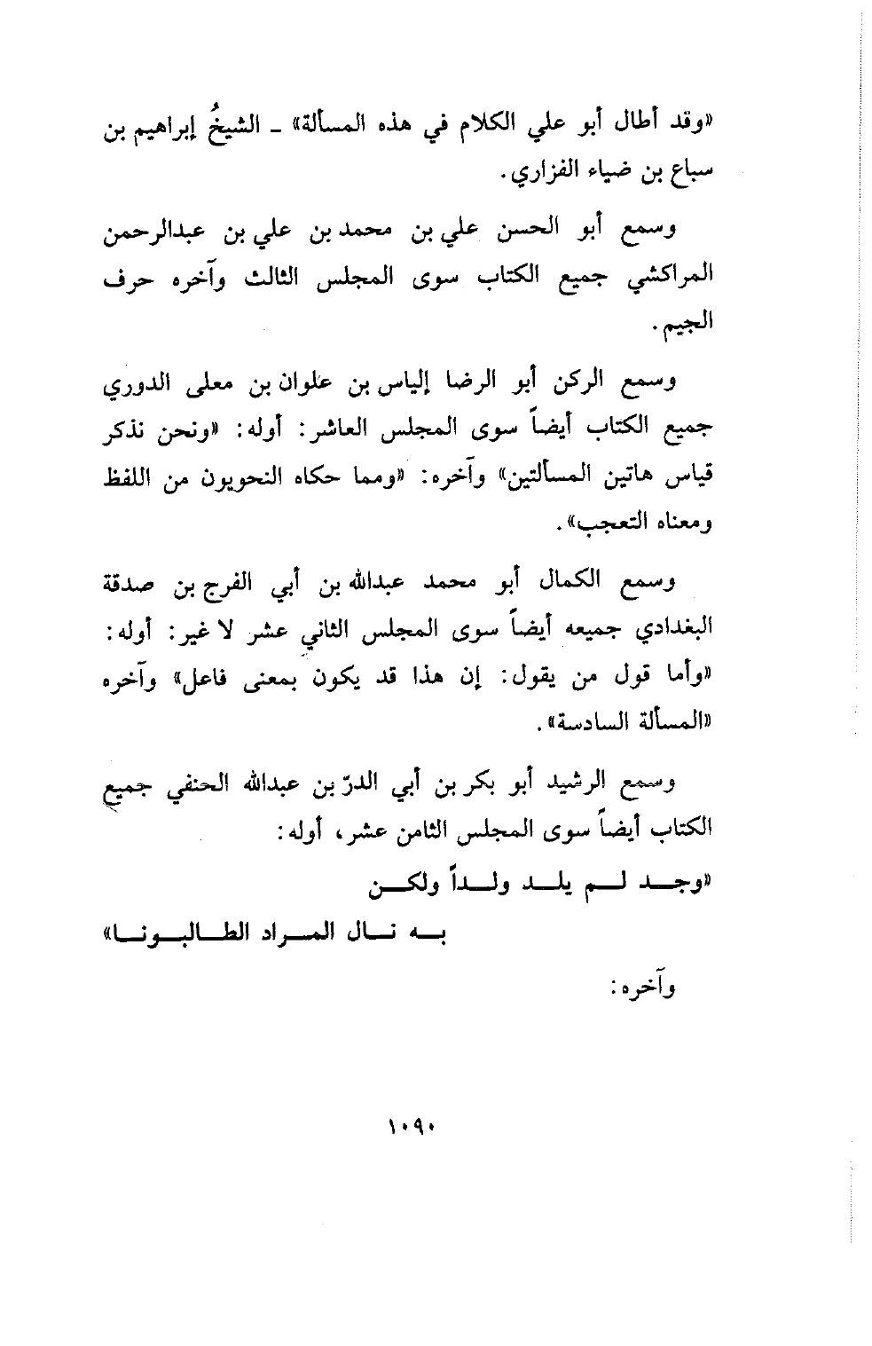 وسمع الكمال أبو محمد عبد الله بن أبي الفرج بن صدقة البغدادي جميعه أيضا سوى المجلس الثاني عشر لا غير: أوله: (وأما قول من يقول: إن هذا قد يكون بمعنى فاعل) وآخره (المسألة السادسة).