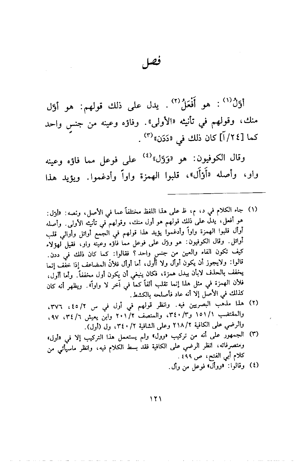 أول: هو أفعل. يدل على ذلك قولهم: هو أول منك، وقولهم في تأنيثه (الأولى). وفاؤه وعينه من جنس واحد كما [24/آ] كان ذلك في (ددن).