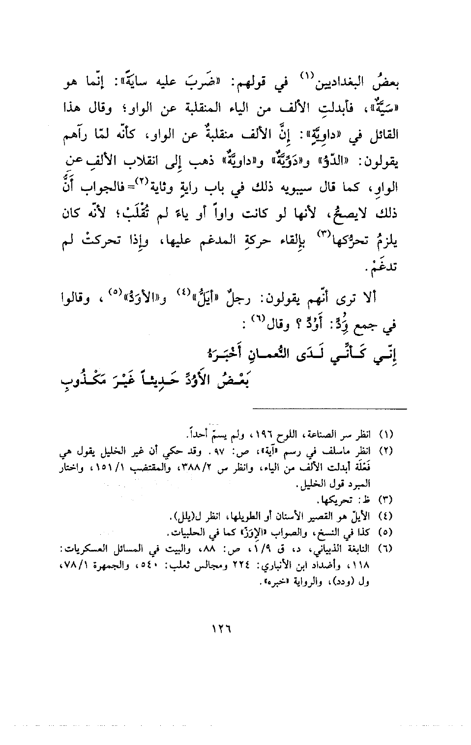 بعض البغداديين في قولهم: (ضرب عليه ساية): إنما هو (سية)، فأبدلت الألف من الياء المنقلبة عن الواو؛ وقال هذا القائل في (داوية): إن الألف منقلبة عن الواو، كأنه لما رآهم يقولون: (الدؤ) و (دوية) و (داوية) ذهب إلى انقلاب الألف عن الواو، كما قال سيبويه ذلك في باب راية وثاية فالجواب أن ذلك لا يصح، لأنها لو كانت واوا أو ياء لم تقلب؛ لأنه كان يلزم تحركها بإلقاء حركة المدغم عليها، وإذا تحركت لم تدغم.