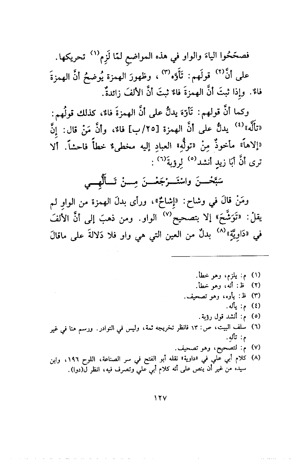 وكما أن قولهم: تأوه يدل على أن الهمزة فاء، كذلك قولهم: (تأله) يدل على أن الهمزة [25/ب] فاء، وأن من قال: إن (إلاها) مأخوذ من (توله) العباد إليه مخطئ خطأ فاحشا. ألا ترى أن أبا زيد أنشد لرؤبة: