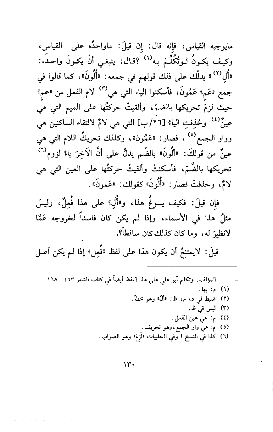 ما يوجبه القياس، فإنه قال: إن قيل: ماواحده على القياس، وكيف يكون لو تكلم به؟ قال: ينبغي أن يكون واحده: (أل) يدلك على ذلك قولهم في جمعه: (ألون)، كما قالوا في جمع (عم) عمون، فأسكنوا الياء التي هي لام الفعل من (عم) حيث لزم تحريكها بالضم، وألقيت حركتها على الميم التي هي عين وحذفت الياء [26/ب] التي هي لام لالتقاء الساكنين هي وواو الجمع، فصار: (عمون)، وكذلك تجريك اللام التي هي عين من قولك: (ألون) بالضم يدل على أن الآخر ياء لزوم تحريكها بالضم، فأسكنت وألقيت حركتها على العين التي هي لام، وحذفت فصار: (ألون) كقولك: (عمون).