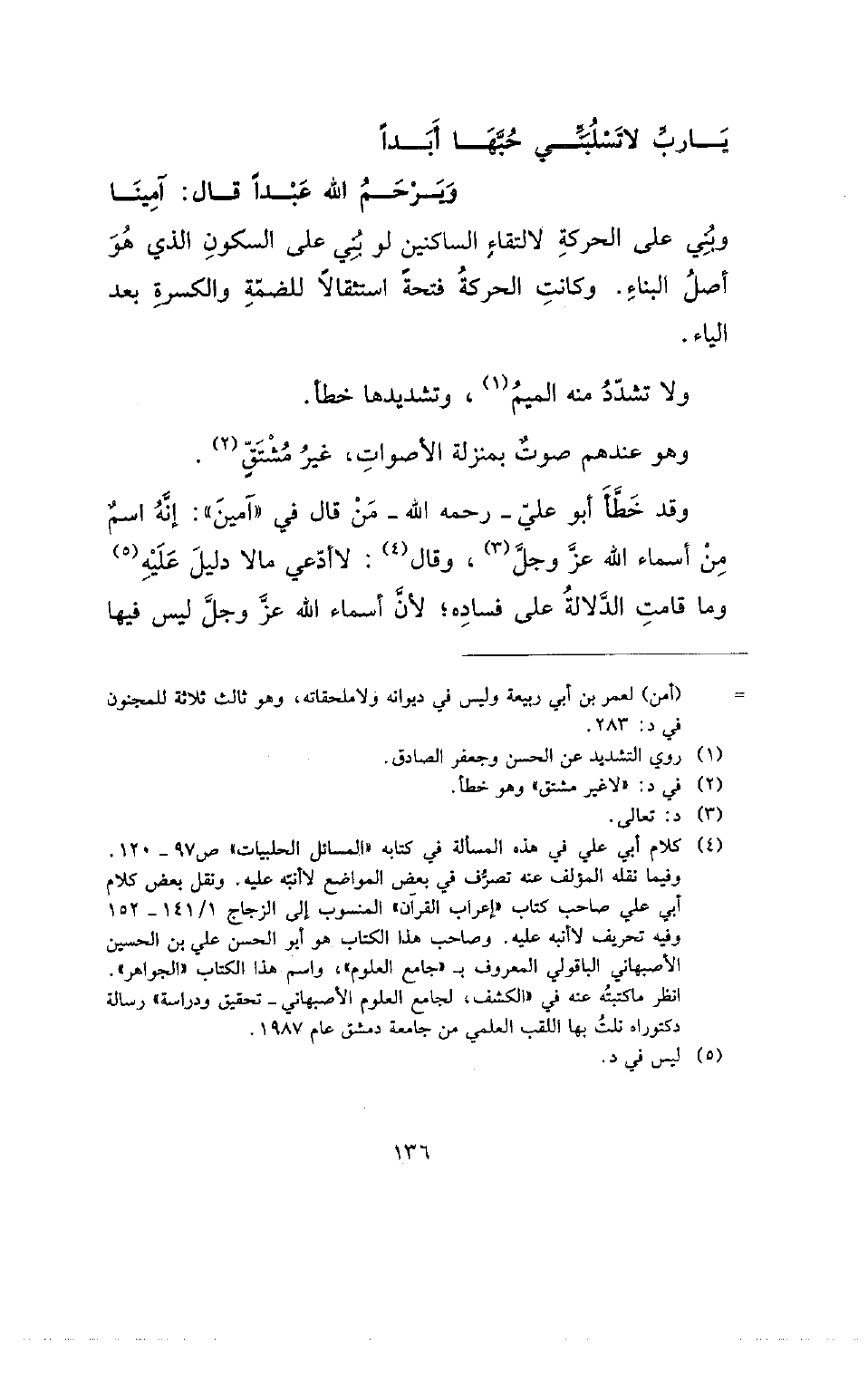 وقد خطأ أبو علي- رحمه الله- من قال في (آمين): إنه اسم من أسماء الله عز وجل، وقال: لا أدعي ما لا دليل عليه وما قامت الدلالة على فساده؛ لأن أسماء الله عز وجل ليس فيها