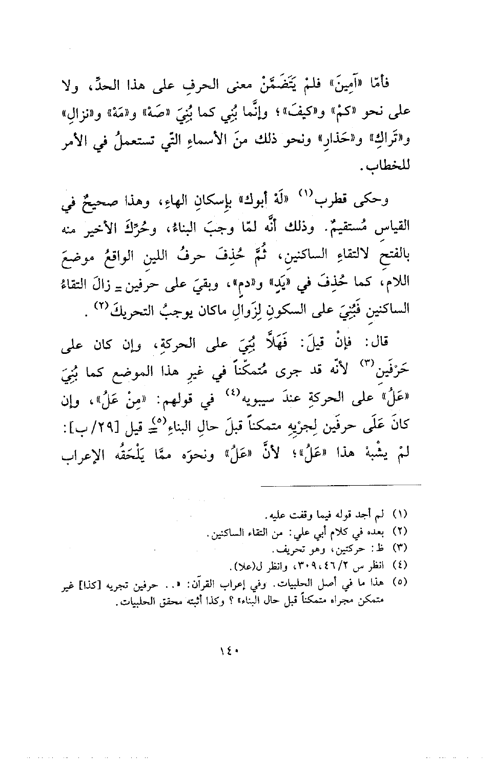 قال: فإن قيل: فهلا بني على الحركة، وإن كان على حرفين لأنه قد جرى متمكنا في غير هذا الموضع كما بني (عل) على الحركة عند سيبويه في قولهم: (من عل)، وإن كان على حرفين لجريه متمكنا قبل حال البناء قيل [29/ب]: لم يشبه هذا (عل)؛ لأن (عل) ونحوه مما يلحقه الإعراب