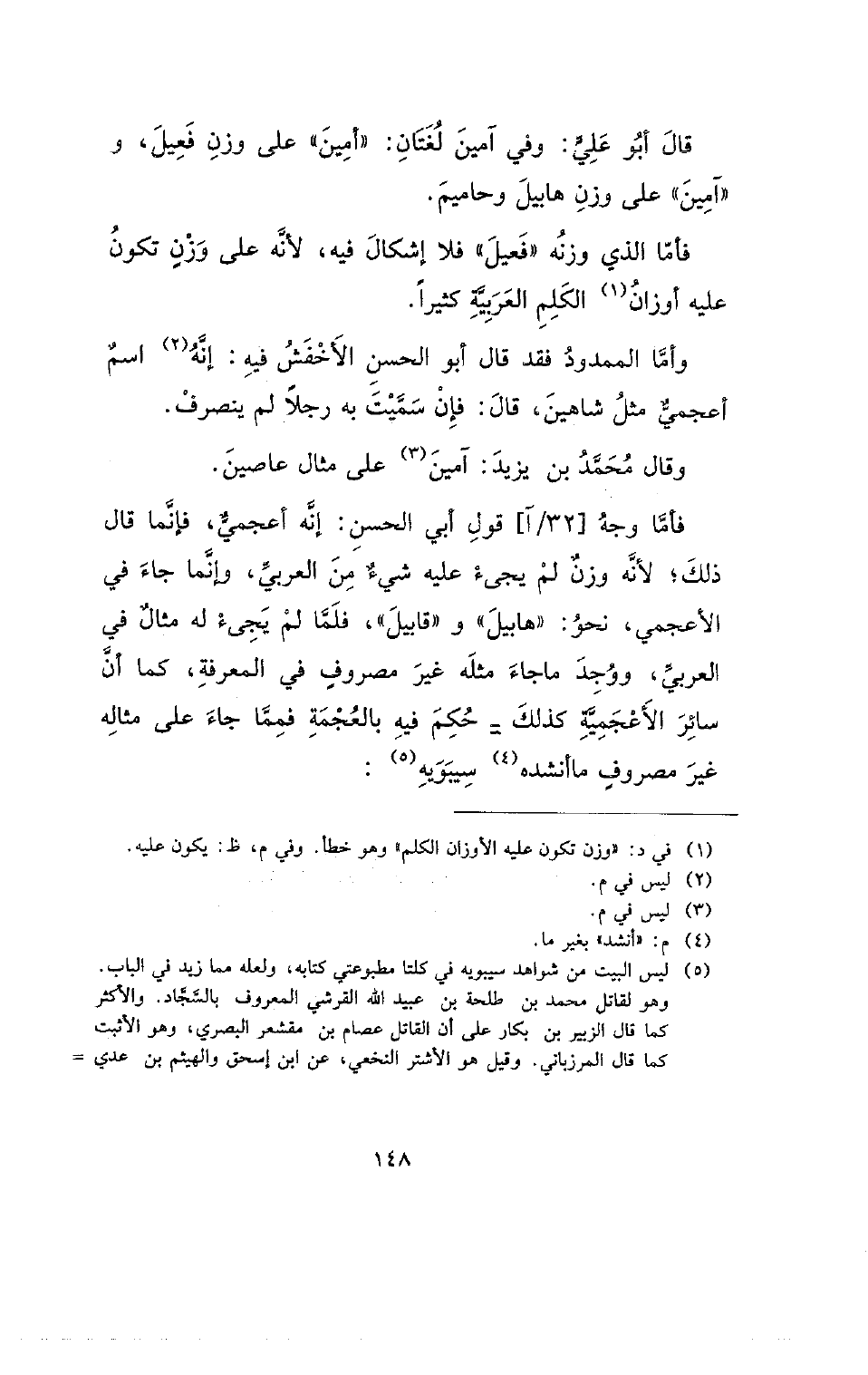 فأما وجه [32/آ] قول أبي الحسن: إنه أعجمي، فإنما قال ذلك؛ لأنه وزن لم يجئ عليه شيء من العربي، وإنما جاء في الأعجمي، نحو: (هابيل) و (قابيل)، فلما لم يجئ له مثال في العربي، ووجد ما جاء مثله غير مصروف في المعرفة، كما أن سائر الأعجمية كذلك حكم فيه بالعجمة فمما جاء على مثاله غير مصروف ما أنشده سيبويه: