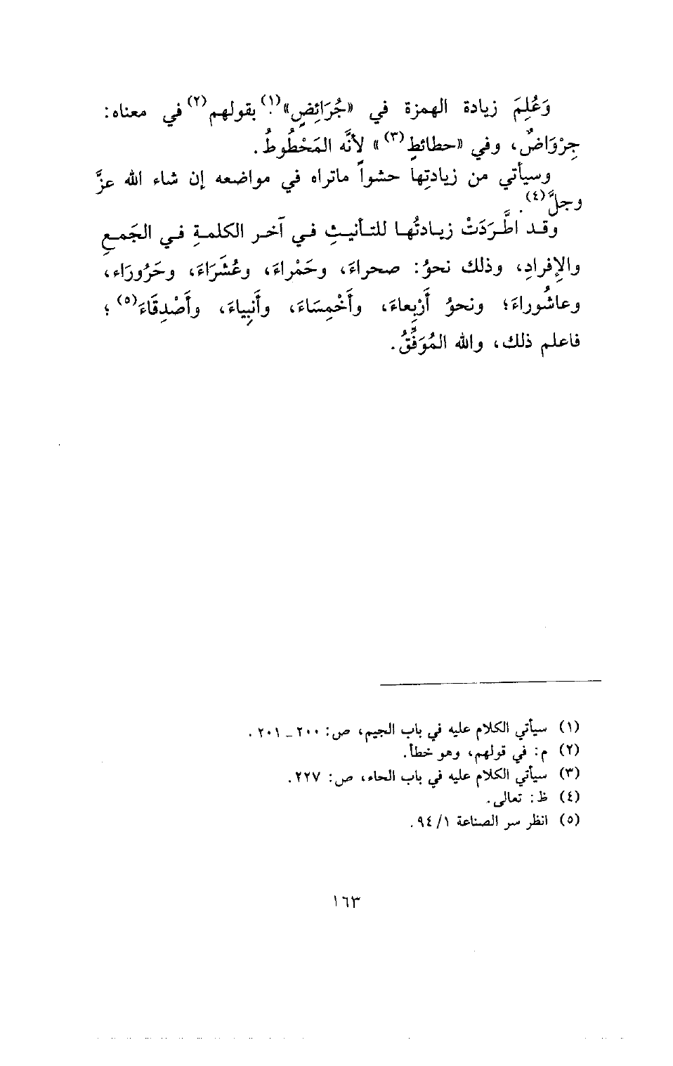 وقد اطردت زيادتها للتأنيث في آخر الكلمة في الجمع والإفراد، وذلك نحو: صحراء.، وحمراء، وعشراء، وحروراء، وعاشوراء؛ ونحو أربعاء، وأخمساء، وأنبياء، وأصدقاء؛ فاعلم ذلك، والله الموفق.