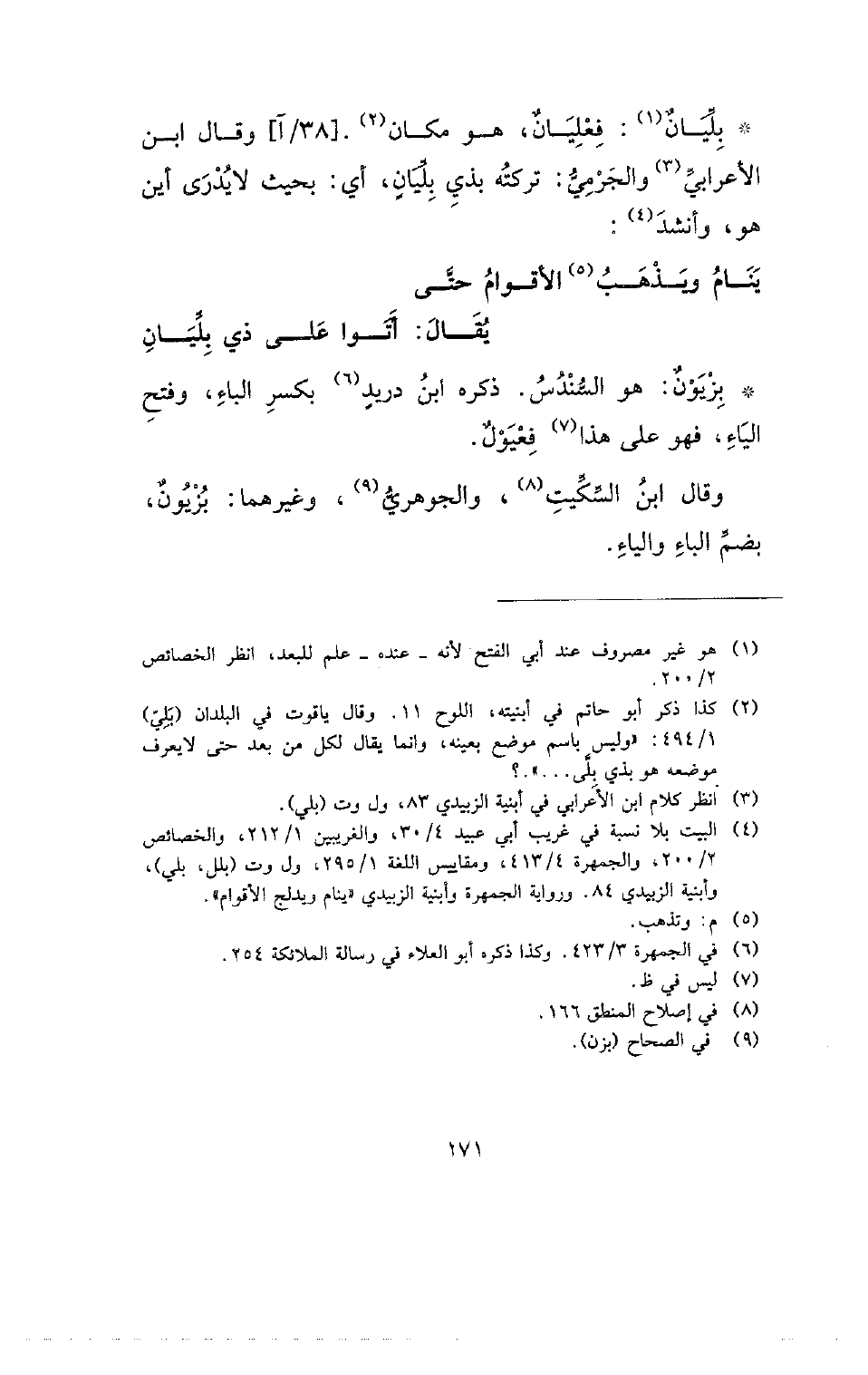 * بليان: فعليان، هو مكان. [38/آ] وقال ابن الأعرابي والجرمي: تركته بذي بليان، أي: بحيث لا يدرى أين هو، وأنشد: