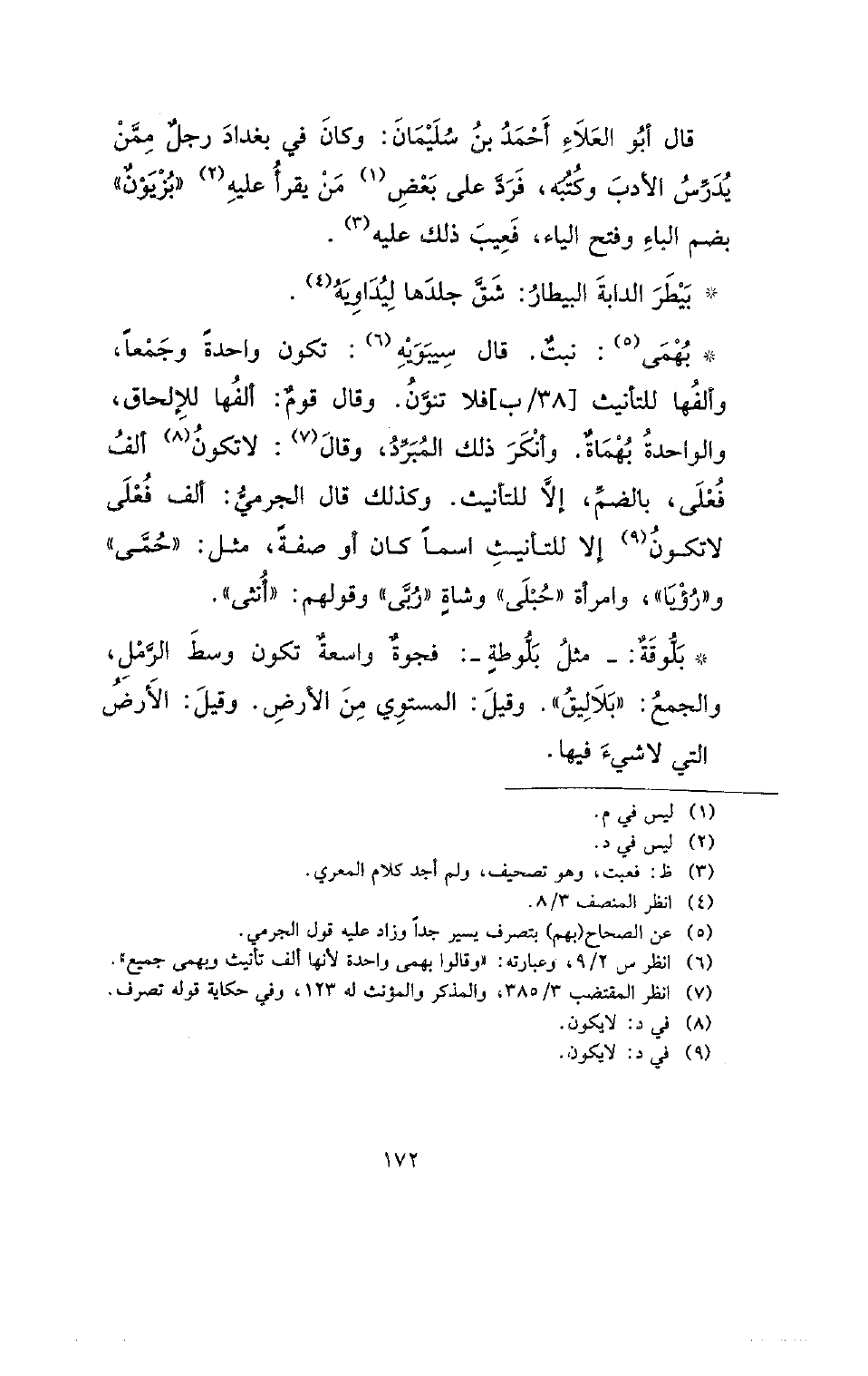 قال أبو العلاء أحمد بن سليمان: وكان في بغداد رجل ممن يدرس الأدب وكتبه، فرد على بعض من يقرأ عليه (بزيون) بضم الباء وفتح الياء؛ فعيب ذلك عليه.