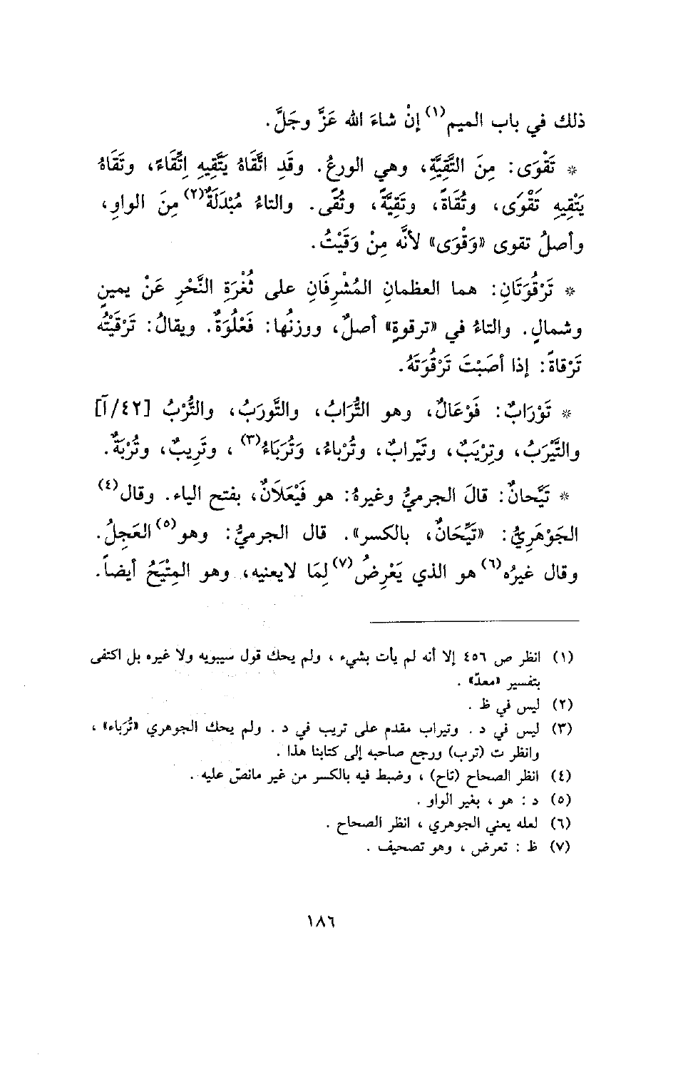 * توراب: فوعال، وهو التراب، والتورب، والترب [42/آ] والتيرب، وتريب، وتيراب، وترباء، وترباء، وتريب، وتربة.