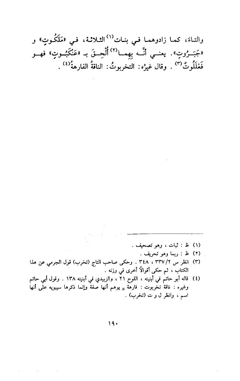 والتاء، كما زادوهما في بنات الثلاثة، في (ملكوت) و (جبروت). يعني أنه بهما ألحق بـ (عنكبوت) فهو فعللوت. وقال غيره: التخربوت: الناقة الفارهة.