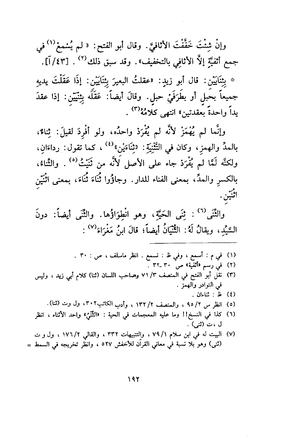وغنما لم يهمز لأنه لم يفرد واحده، ولو أفرد لقيل: ثناء، بالمد والهمز، وكان في التثنية: (ثناءين)، كما تقول: رداءان، ولكنه لما لم يفرد جاء على الأصل لأنه من ثنيت. والثناء، بالكسر والمد، بمعنى الفناء للدار. وجاؤوا ثناء ثناء، بمعنى اثنين اثنين.