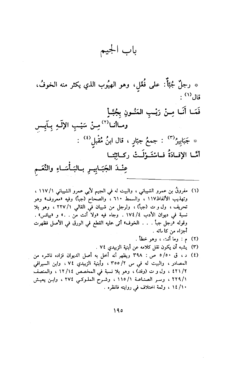 * رجل جبأ: على فعل، وهو الهيوب الذي يكثر منه الخوف، قال:
