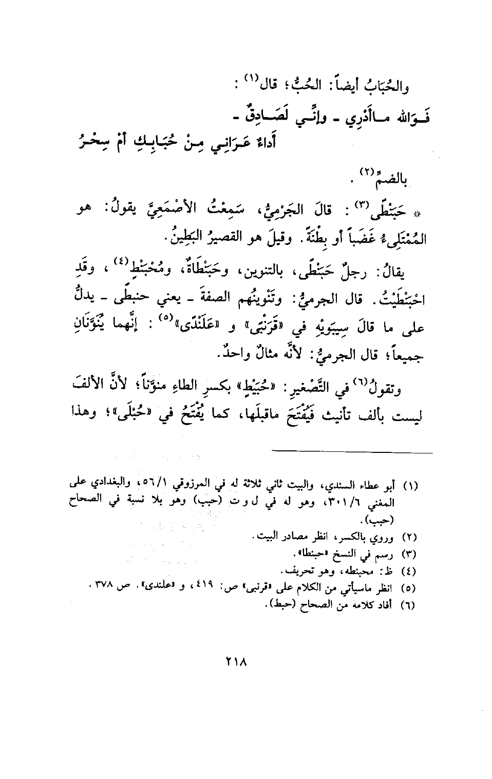 يقال: رجل حبنطى، بالتنوين، وحبنطاة، ومحنبط، وقد احبنطيت. قال الجرمي: وتنوينهم الصفة- يعني حنبطى- يدل على ما قال سيبويه في (قرنبى) و (علندى): إنهما ينونان جميعا؛ قال الجرمي: لأنه مثال واحد.