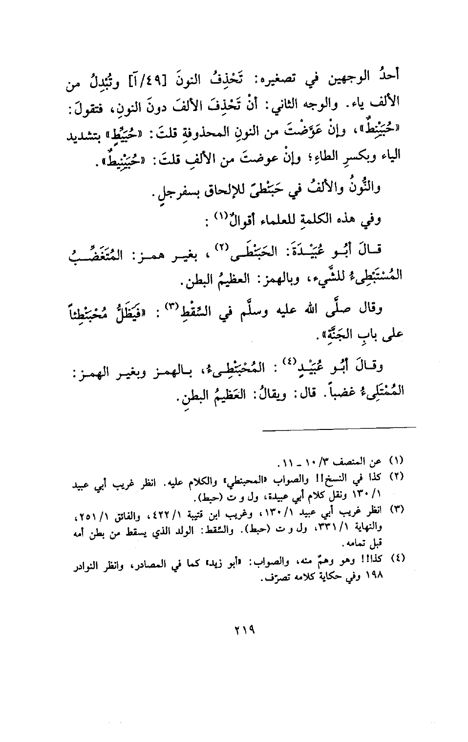 أحد الوجهين في تصغيره: تحذف النون [49/آ] وتبدل من الألف ياء. والوجه الثاني: أن تحذف الألف دون النون، فتقول: (حنبيط)، وإن عوضت من النون المحذوفة قلت: (حبيط) بتشديد الياء وبكسر الطاء؛ وإن عوضت من الألف قلت: (حبينيط).