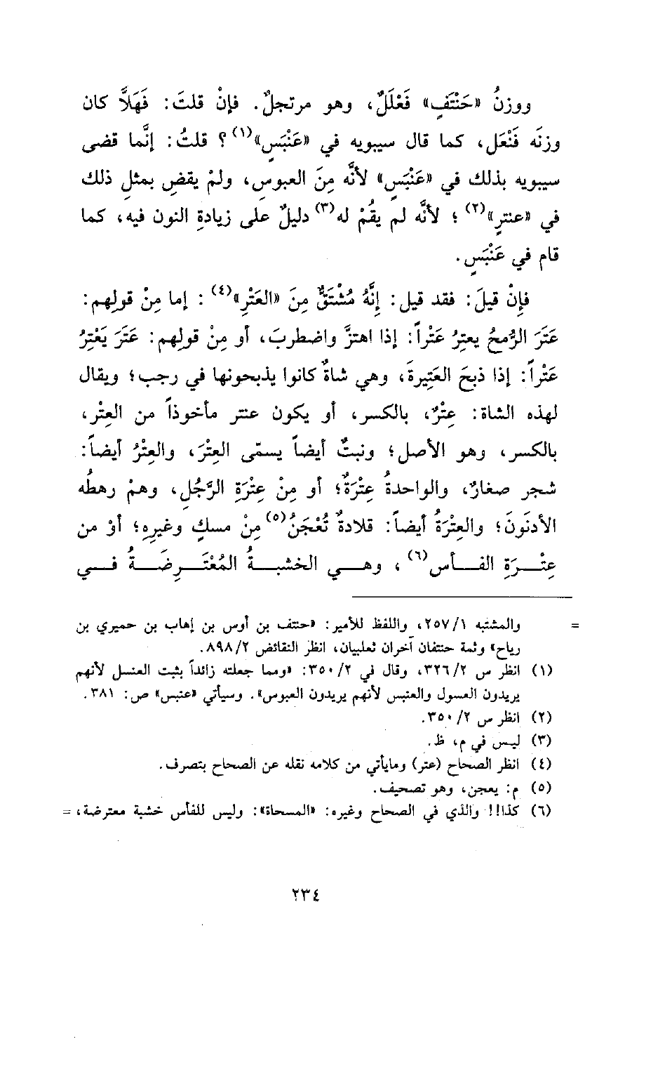 ووزن (حنتف) فعلل، وهو مرتجل. فإن قلت: فهلا كان وزنه فنعل، كما قال سيبويه في (عنبس)؟ قلت: إنما قضى سيبويه بذلك في (عنبس) لأنه من العبوس، ولم يقض بمثل ذلك في (عنتر)؛ لأنه لم يقم له دليل على زيادة النون فيه، كما قام في عنبس.