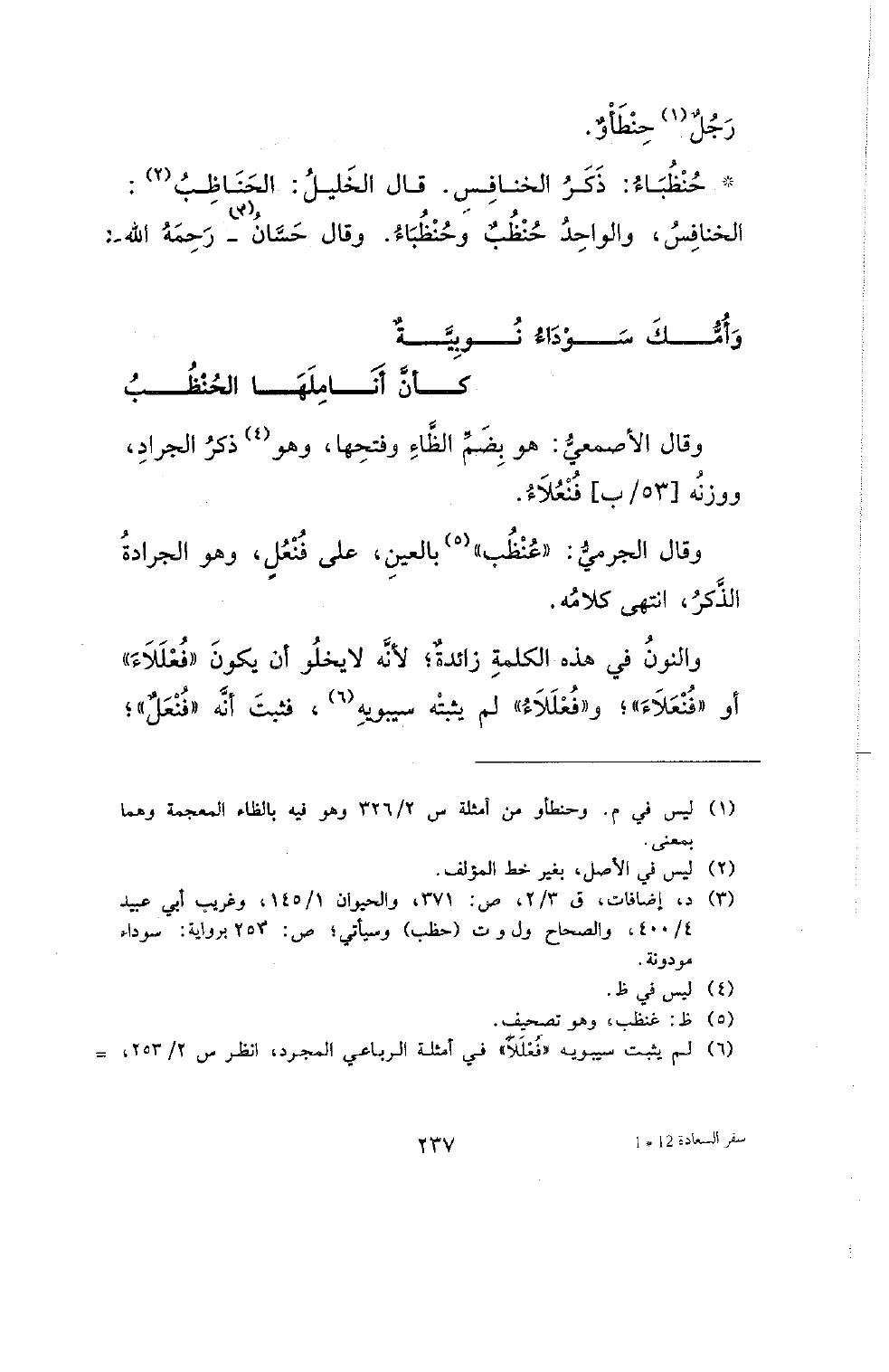 * حنظباء: ذكر الخنافس. قال الخليل: الحناظب: الخنافس، والواحد حنظب وحنظباء. وقال حسان- رحمه الله-: