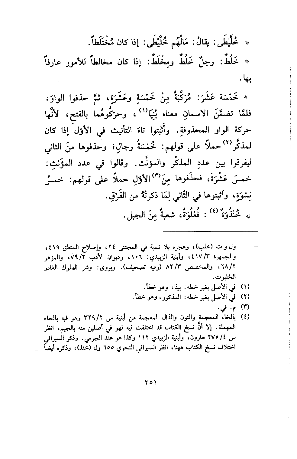 * خمسة عشر: مركبة من خمسة وعشرة، ثم حذفوا الواو، فلما تضمن الاسمان معناه بنيا، وحركوهما بالفتح، لأنها حركة الواو المحذوفة. وأثبتوا تاء التأنيث في الأول إذا كان لمذكر حملا على قولهم: خمسة رجال؛ وحذفوها من الأول حملا على قولهم: خمس نسوة، وأثبتوها في الثاني لما ذكرته من الفرق.