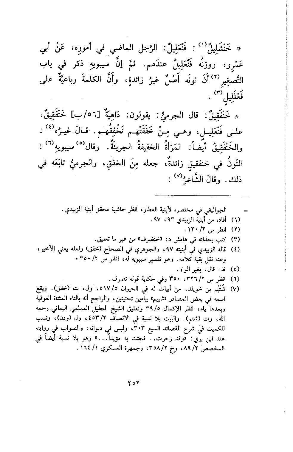 * خنشليل: فنعليل: الرجل الماضي في أموره، عن أبي عمرو، ووزنه فنعليل عندهم. ثم إن سيبويه ذكر في باب التصغير أن نونه أصل غير زائدة، وأن الكلمة رباعية على فعلليل.