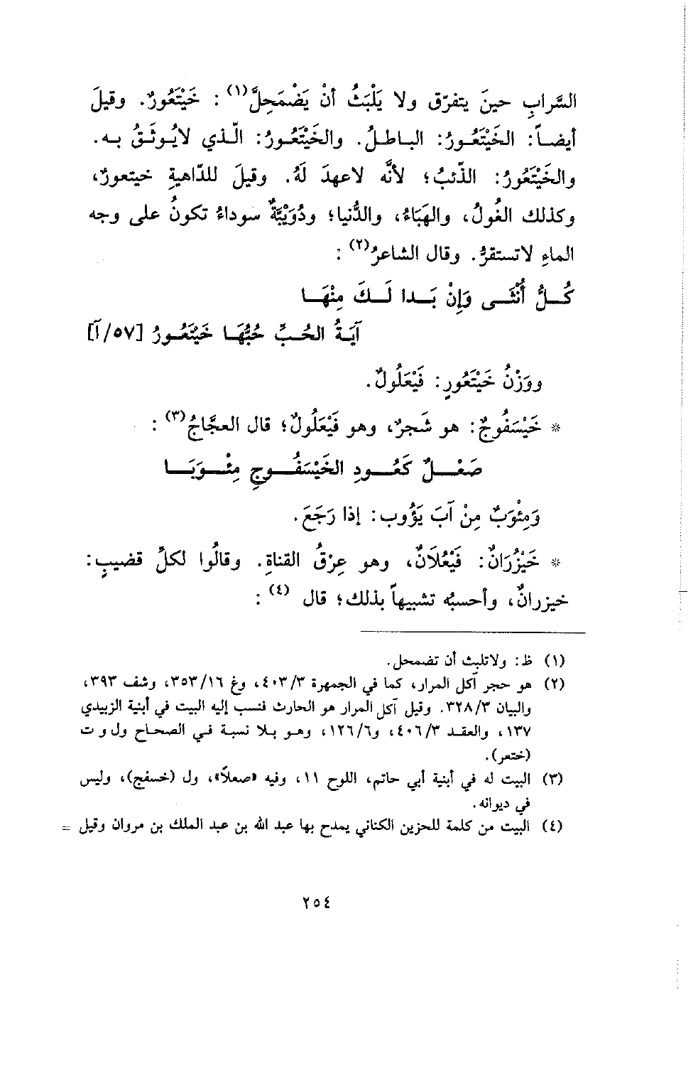 السراب حين يتفرق ولا يلبث أن يضمحل: خيتعور. وقيل أيضا: الخيتعور: الباطل. والخيتعور: الذي لا يوثق به. والخيتعور: الذئب؛ لأنه لا عهد له. وقيل للداهية خيتعور، وكذلك الغول، والهباء، والدنيا؛ ودويبة سوداء تكون على وجه الماء لا تستقر. وقال الشاعر: