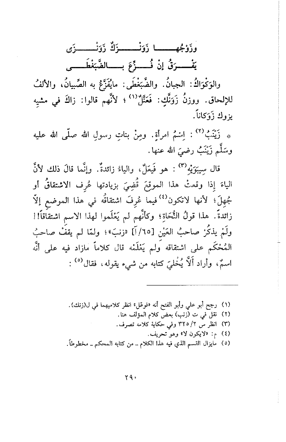 قال سيبويه: هو فيعل، والياء زائدة. وإنما قال ذلك لأن الياء زائدة إذا وقعت هذا الموقع قضي بزيادتها عرف الاشتقاق أو جهل؛ لأنها لا تكون في ما عرف اشتقاقه في هذا الموضع إلا زائدة. هنا قول النحاة؛ وكأنهم لم يعلموا لهذا الاسم اشتقاقا!! ولم يذكر صاحب العين [65/آ] (زنب)؛ ولما لم يقف صاحب المحكم على اشتقاقه ولم يعلمه قال كلاما ما زاد فيه على أنه اسم، وأراد ألا يخلى كتابه من شيء يقوله، فقال: