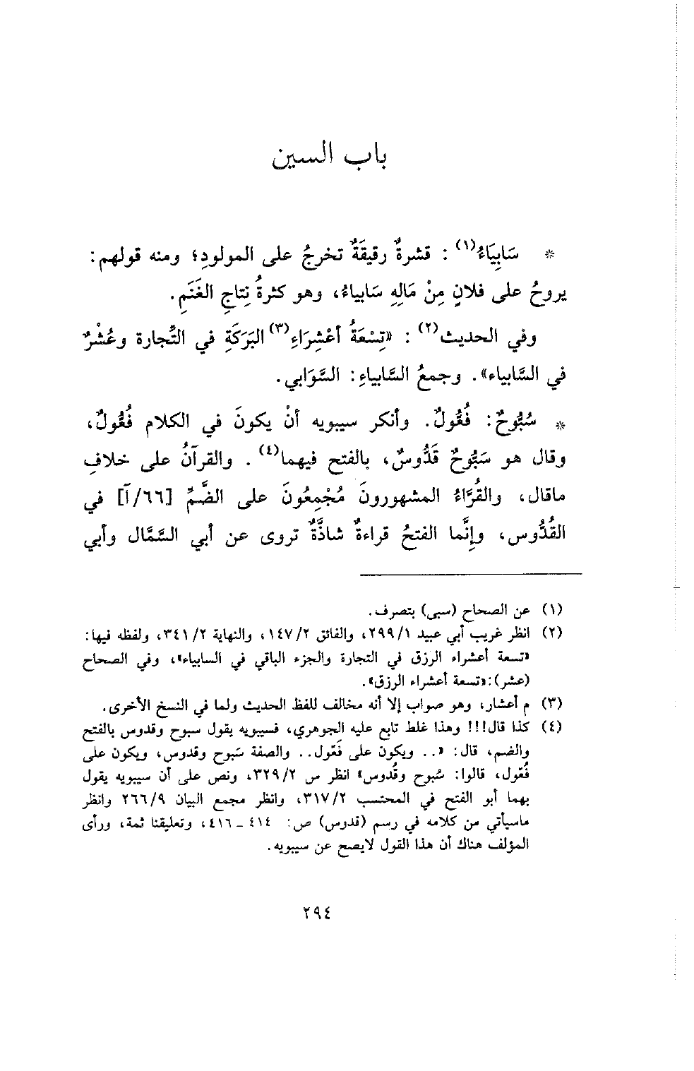 * سبوح: فعول. وأنكر سيبويه أن يكون في الكلام فعول، وقال هو سبوح قدوس، بالفتح فيهما. والقرآن على خلاف ما قاله، والقراء المشهورون مجمعون على الضم [66/آ] في القدوس، وإنما الفتح قراءة شاذة تروى عن أبي السمال وأبي