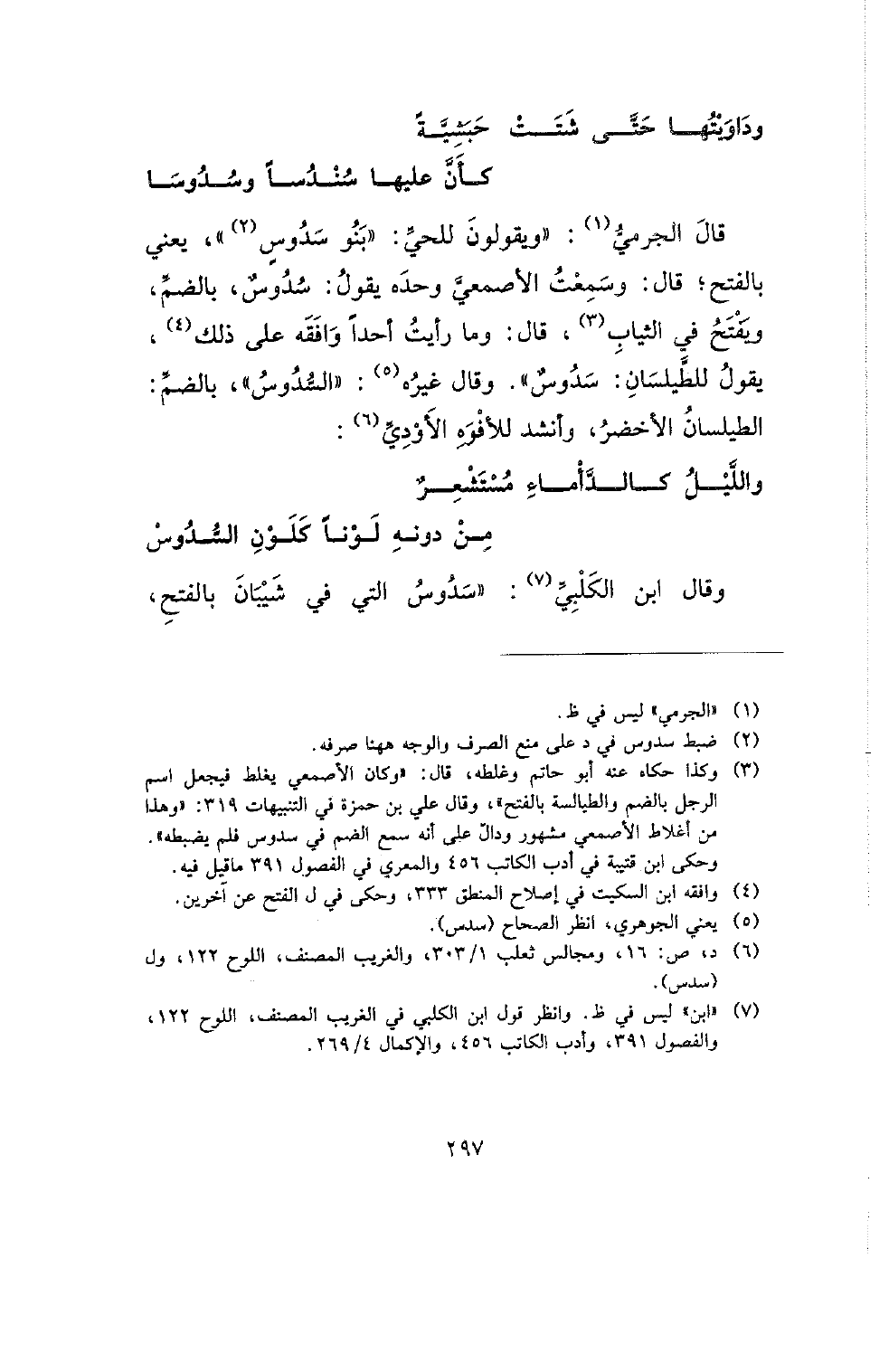 قال الجرمي: (ويقولون للحي: (بنو سدوس)، يعني بالفتح؛ قال: وسمعت الأصمعي وحده يقول: سدوس، بالضم، ويفتح في الثياب، قال: وما رأيت أحدا وافقه على ذلك، يقول للطيلسان: سدوس). وقال غيره: (السدوس)، بالضم: الطيلسان الأخضر، وأنشد للأفوه الأودي: