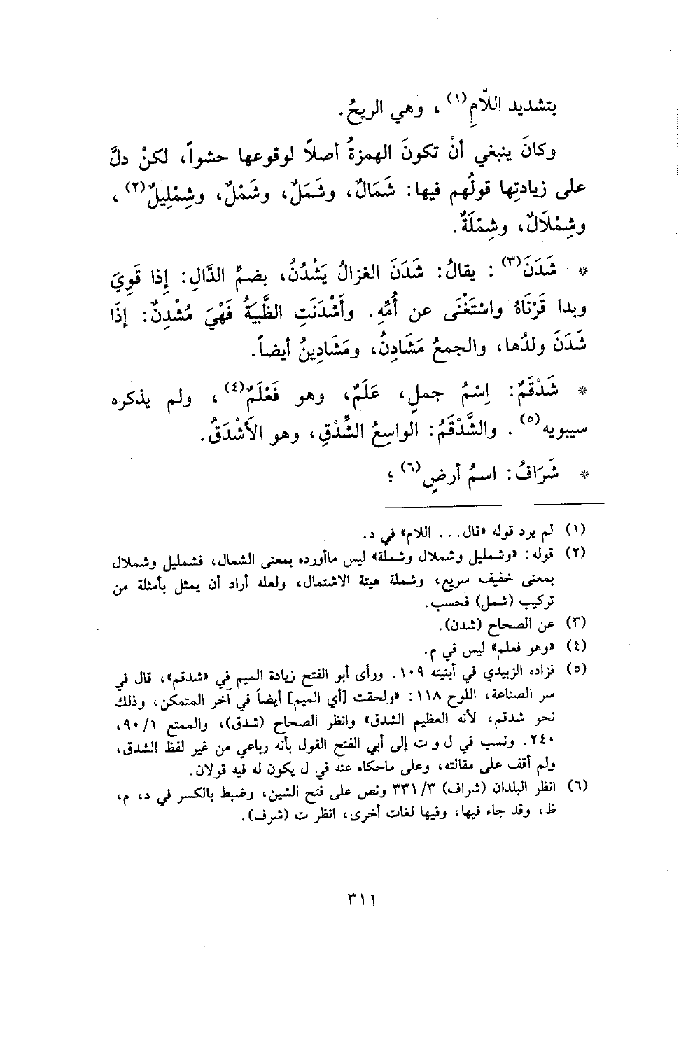 وكان ينبغي أن تكون الهمزة أصلا لوقوعها حشوا، لكن دل على زيادتها قولهم فيها: شمال، وشمل، وشمل، وشمليل، وشملال، وشملة.
