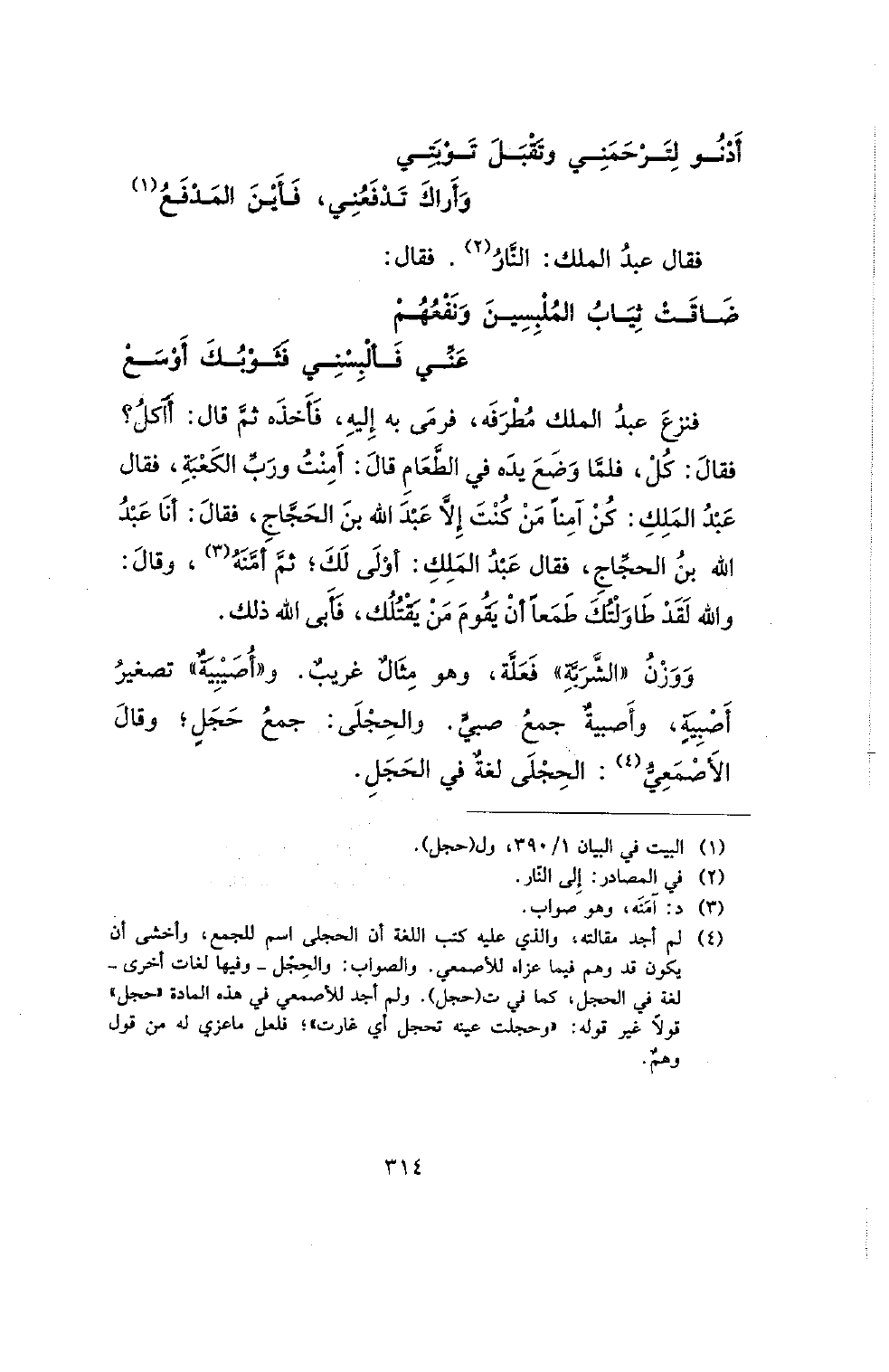 فنزع عبد الملك مطرفه، فرمى به إليه، فأخذه ثم قال: أآكل. فقال: كل، فلما وضع يده في الطعام قال: أمنت ورب الكعبة، فقال عبد الملك: كن آمنا من كنت إلا عبد الله بن الحجاج، فقال: أنا عبد الله بن الحجاج، فقال عبد الملك، أولى لك؛ ثم أمنه، وقال: والله لقد طاولتك طمعا أن يقوم من يقتلك، فأبى الله ذلك.