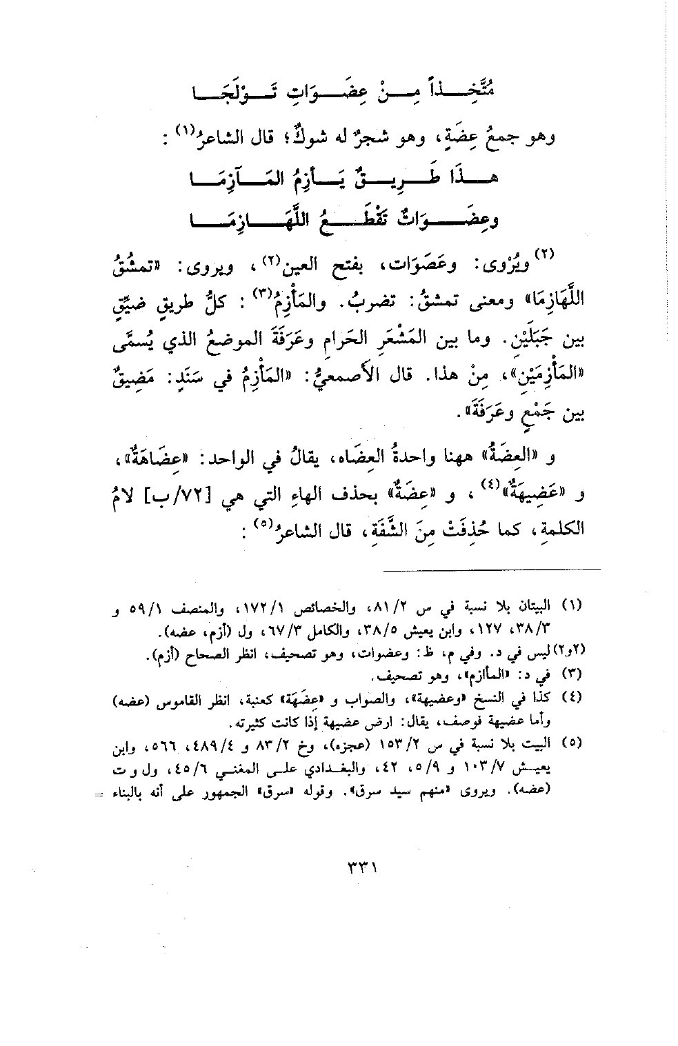 ويروى: وعصوات، بفتح العين، ويروى: (تمشق اللهازما) ومعنى تمشق: تضرب. والمأزم: كل طريق ضيق بين جبلين. وما بين المشعر الحرام وعرفة الموضع الذي يسمى (المأزمين)، من هذا. قال الأصمعي: (المأزم في سند: مضيق بين جمع وعرفة).