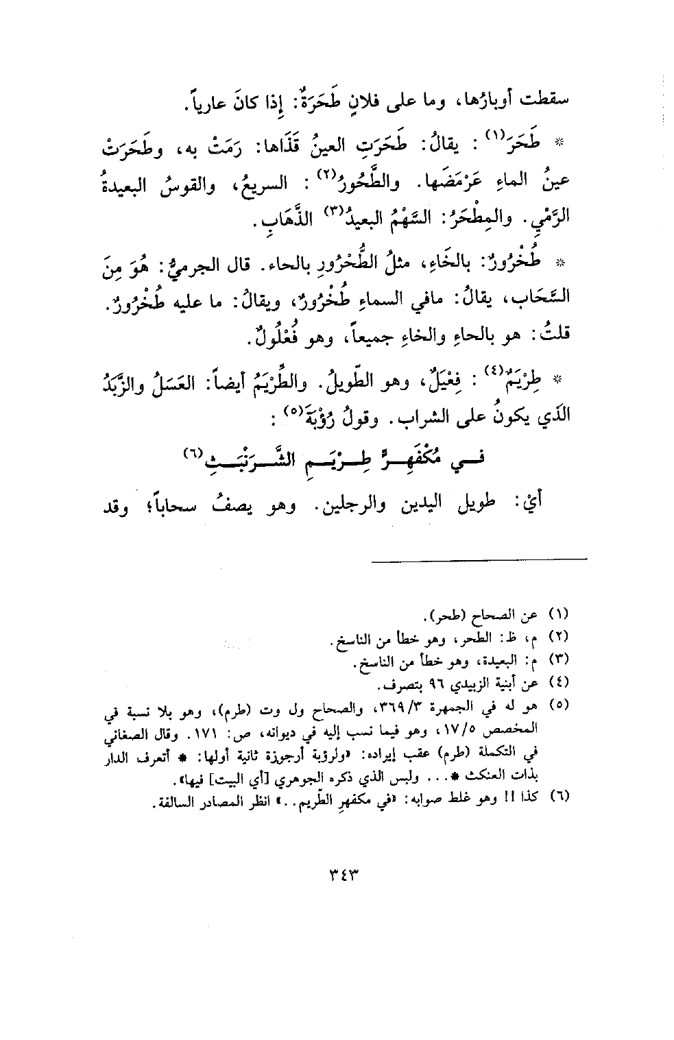 *طحر: يقال: طحرت العين قذاها: رمت به، وطحرت عين الماء عرمضها. والطحور: السريع، والقوس البعيدة الرمي. والمطحر: السهم البعيد الذهاب.