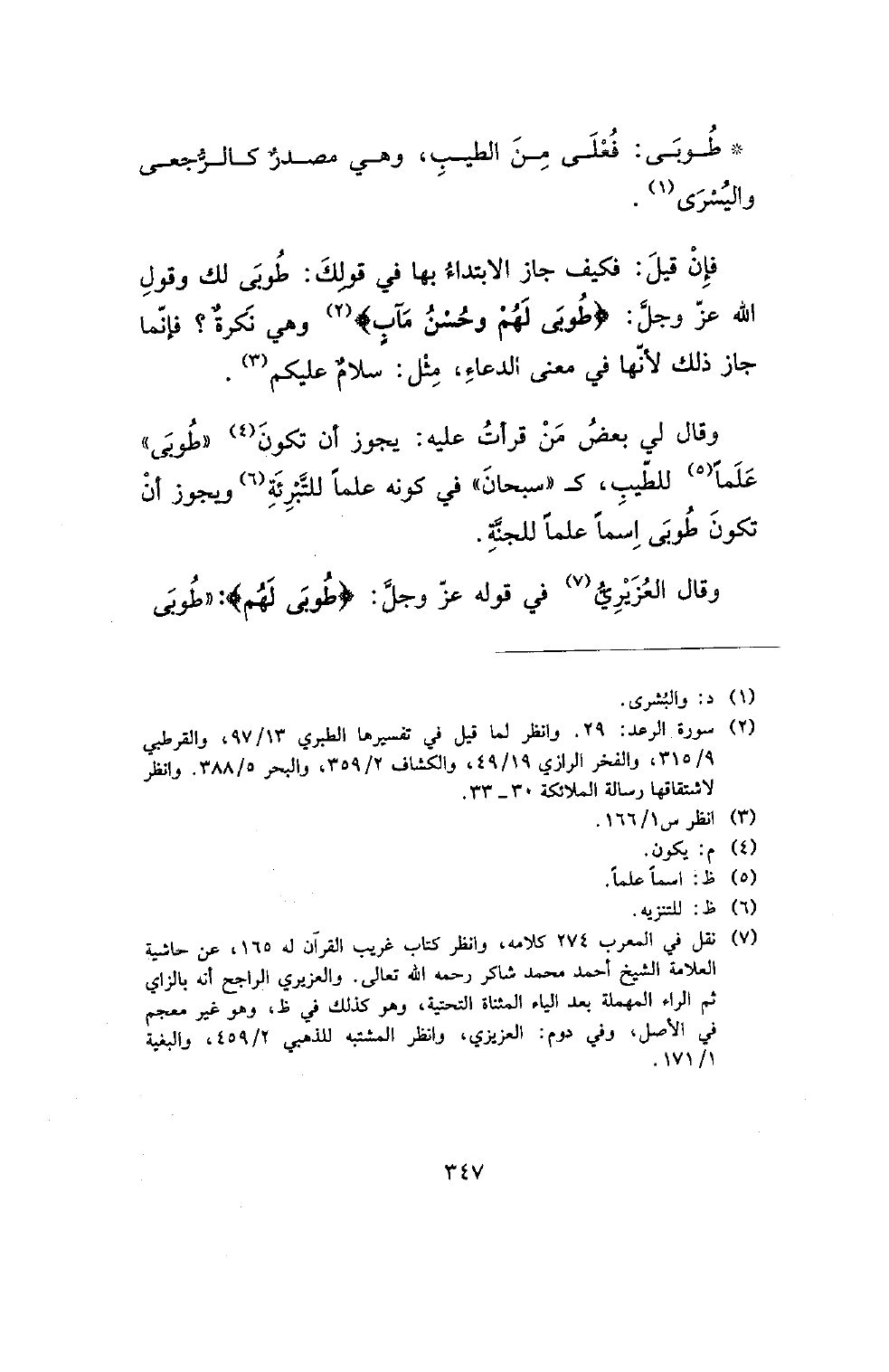 وقال لي بعض من قرأت عليه: يجوز أن تكون (طوبى) علما للطيب، كـ (سبحان) في كونه علما للتبرئة ويجوز أن تكون طوبى اسما علما للجنة.