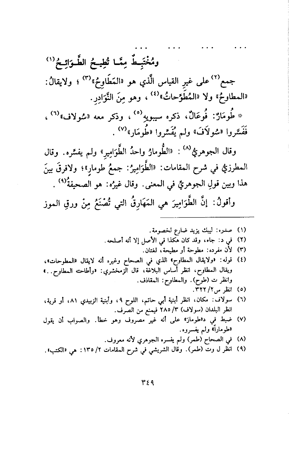 وقال الجوهري: (الطومار واحد الطوامير) ولم يفسره. وقال المطرزي في شرح المقامات: (الطوامير: جمع طومار)؛ ولا فرق بين هذا وبين قول الجوهري في المعنى. وقال غيره: هو الصحيفة.