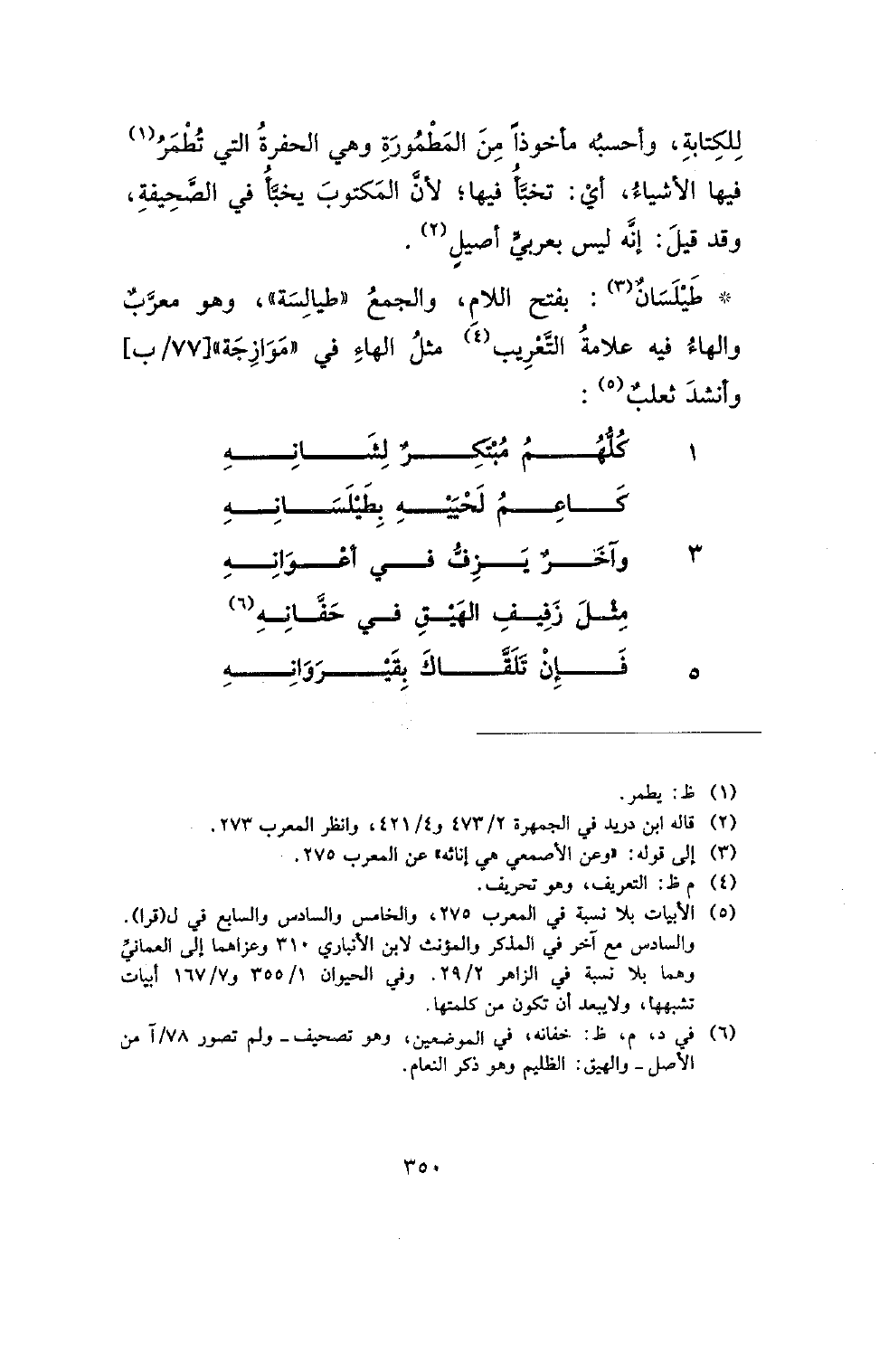 *طيلسان: بفتح اللام، والجمع (طيالسة)، وهو معرب والهاء فيه علامة التعريب مثل الهاء في (موازجة) [77/ب] وأنشد ثعلب:
