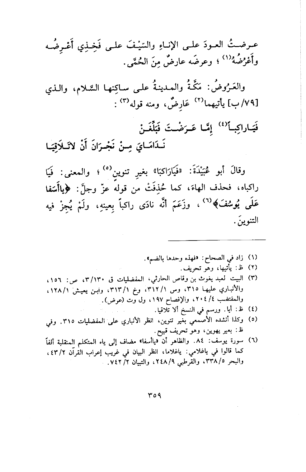 وقال أبو عبيدة: (فياراكبا) بغير تنوين؛ والمعنى: فيا راكباه، فحذف الهاء، كما حذفت من قوله عز وجل: (يا أسفا على يوسف)، وزعم أنه نادى راكبا بعينه، ولم يجز فيه التنوين.