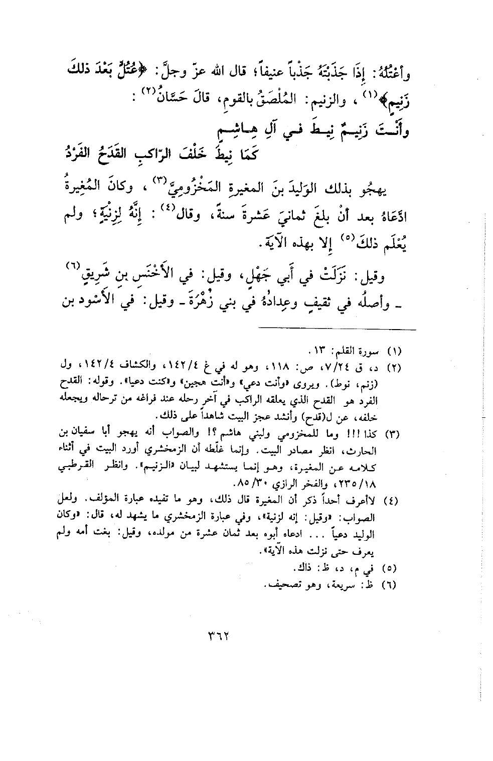 يهجو بذلك الوليد بن المغيرة المخزومي، وكان المغيرة ادعاة بعد أن بلغ ثماني عشرة سنة، وقال: إنه لزنية؛ ولم يعلم ذلك إلا بهذه الآية.