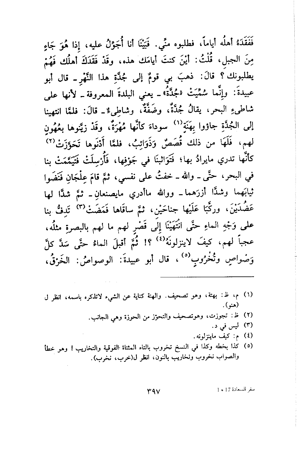 ففقده أهله أياما، فلطبوه مني. فبينا أنا أجول عليه، إذا هو جاء من الجبل، قلت: أين كنت أيامك هذه، وقد فقدك أهلك فهم يطلبونك؟ قال: ذهب بي قوم إلى جدة هذا النهر- قال أبو عبيدة: وإنما سميت (جدة) - يعني البلدة المعروفة- لأنها على شاطئ البحر، يقال جدة، وضفة، وشاطئ- قال: فلما انتيهنا إلى الحدة جاؤوا بهنة سوداء كأنها مهرة، وقد زينوها بعهون لهم، فلها من ذلك قصص وذوائب، فلما أدنوها تحوزت كأنها تدري ما يراد بها؛ فتواثبنا في جوفها، فأرسلت فتيممت بنا في البحر، حتى- والله- خفت على نفسي، ثم قام علجان فنضوا ثيابهما وشدا أزرهما- وواله ما أدري ما يصنعان- ثم شدا لها عضدين، وركبا عليها جناحين، ثم ساقاها فمضت تدف بنا على وجه الماء حتى انتهينا إلى قر لهم ما لهم بالبصرة مثله، عجبا لهم، كيف لا ينزلونه؟! ثم أقبل الماء حتى سد كل وصواص وتخروب، قال أبو عبيدة: الوصواص: الخرق،