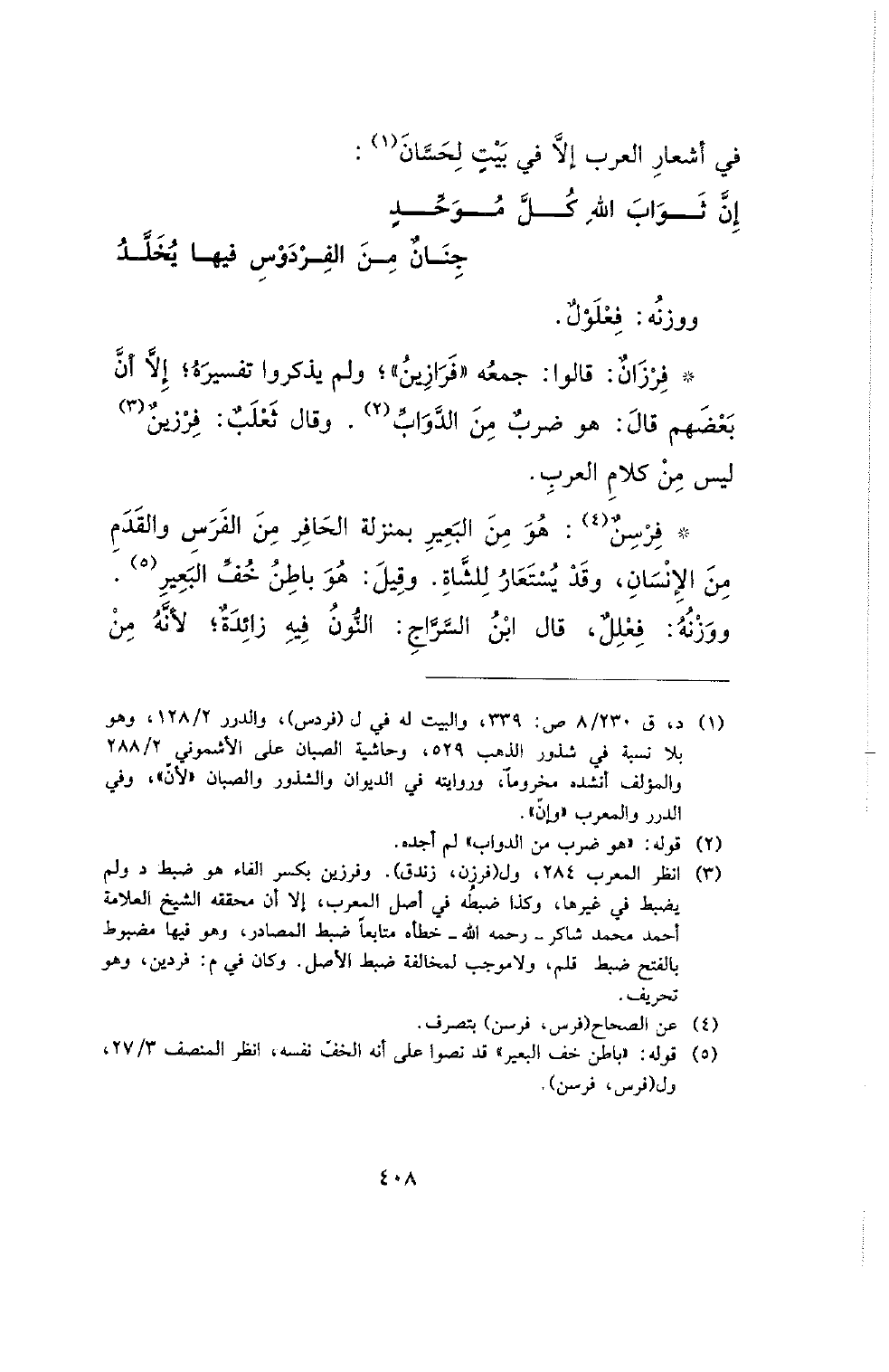 * فرسن: هو من البعير بمنزلة الحافر من الفرس والقدم من الإنسان، وقد يستعار للشاة. وقيل: هو باطن خف البعير. ووزنه: فعلل، قال ابن السراج: النون فيه زائدة؛ لأنه من