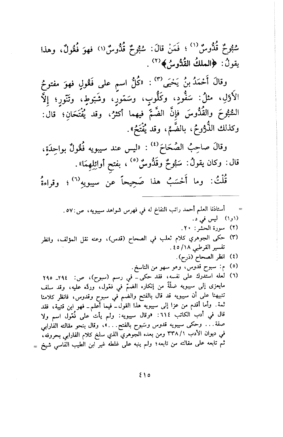 وقال صاحب الصحاح: (ليس عند سيبويه فعول بواحدة، قال: وكان يقول: سبوح قدوس، بفتح أوائلهما).