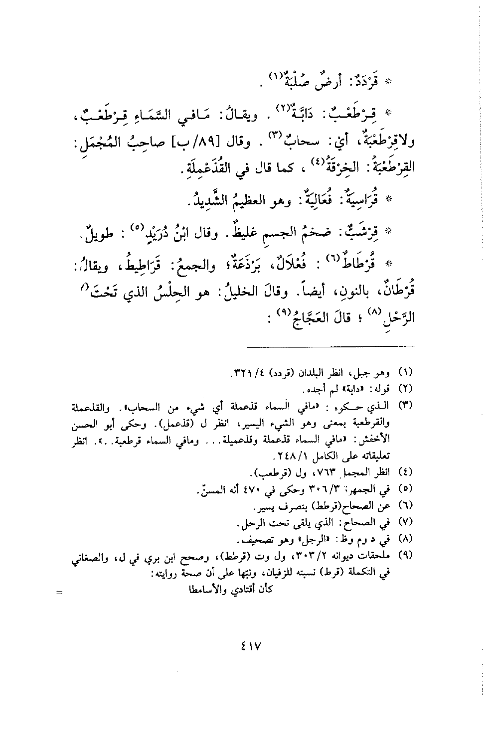 * قرطعب: دابة. ويقال: ما في السماء قرطعب، ولا قرطعبة، أي: سحاب. وقال [89/ب] صاحب المجمل: القرطعبة: الخرقة، كما قال في القذعملة.