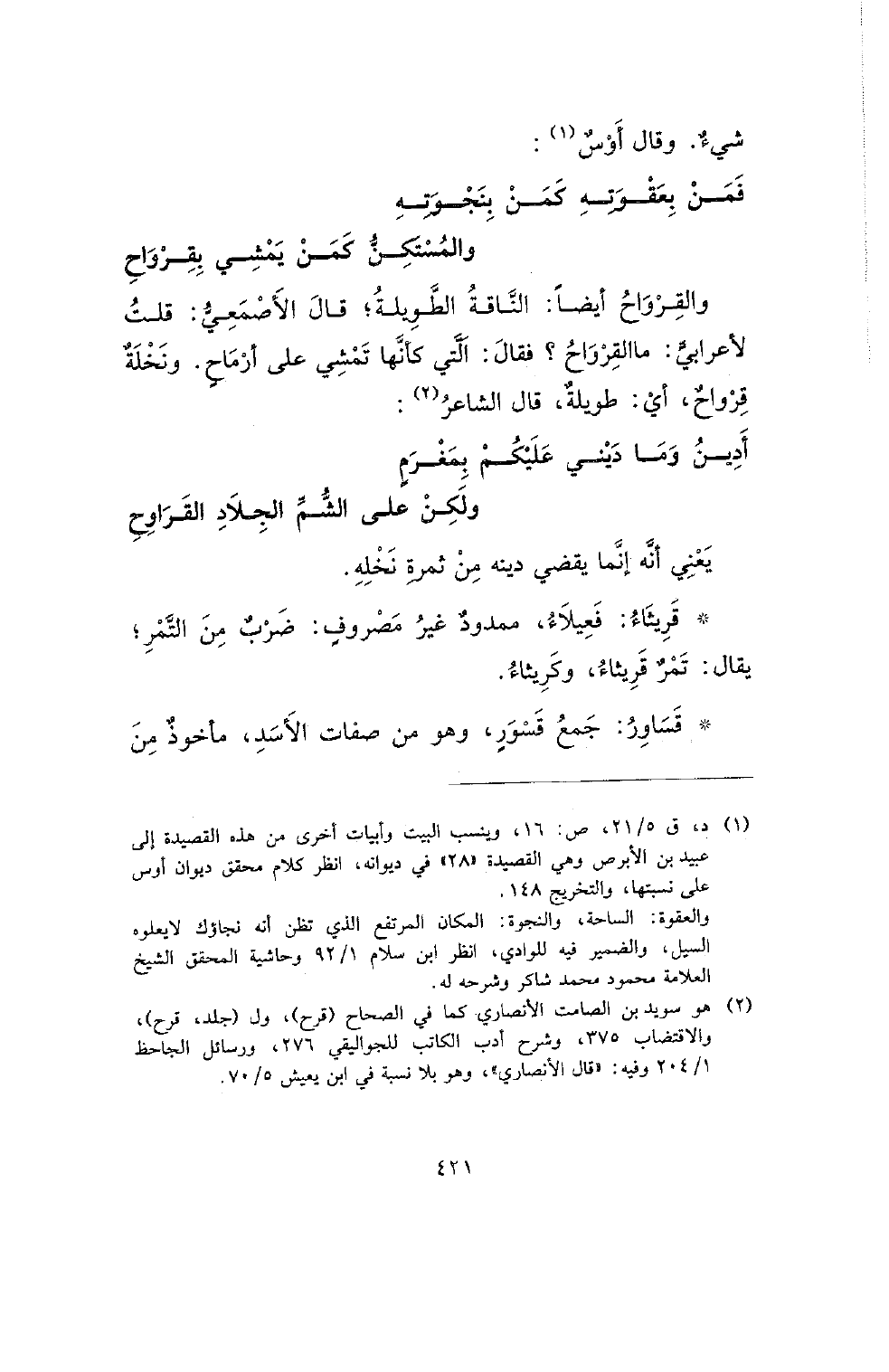 والقرواح أيضا: الناقة الطويلة؛ قال الأصمعي: قلت لأعرابي: ما القرواح؟ فقال: التي كأنها تمشي على أرماح. ونخلة قرواح، أي: طويلة، قال الشاعر: