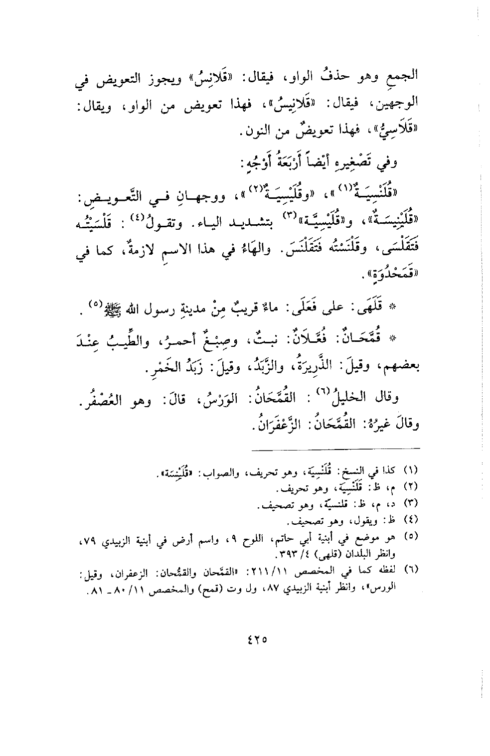 الجمع وهو حذف الواو، فيقال: (قلانس) ويجوز التعويض في الوجهين، فيقال: (قلانيس)، فهذا تعويض من الواو، ويقال: (قلاسي)، فهذا تعويض من النون.