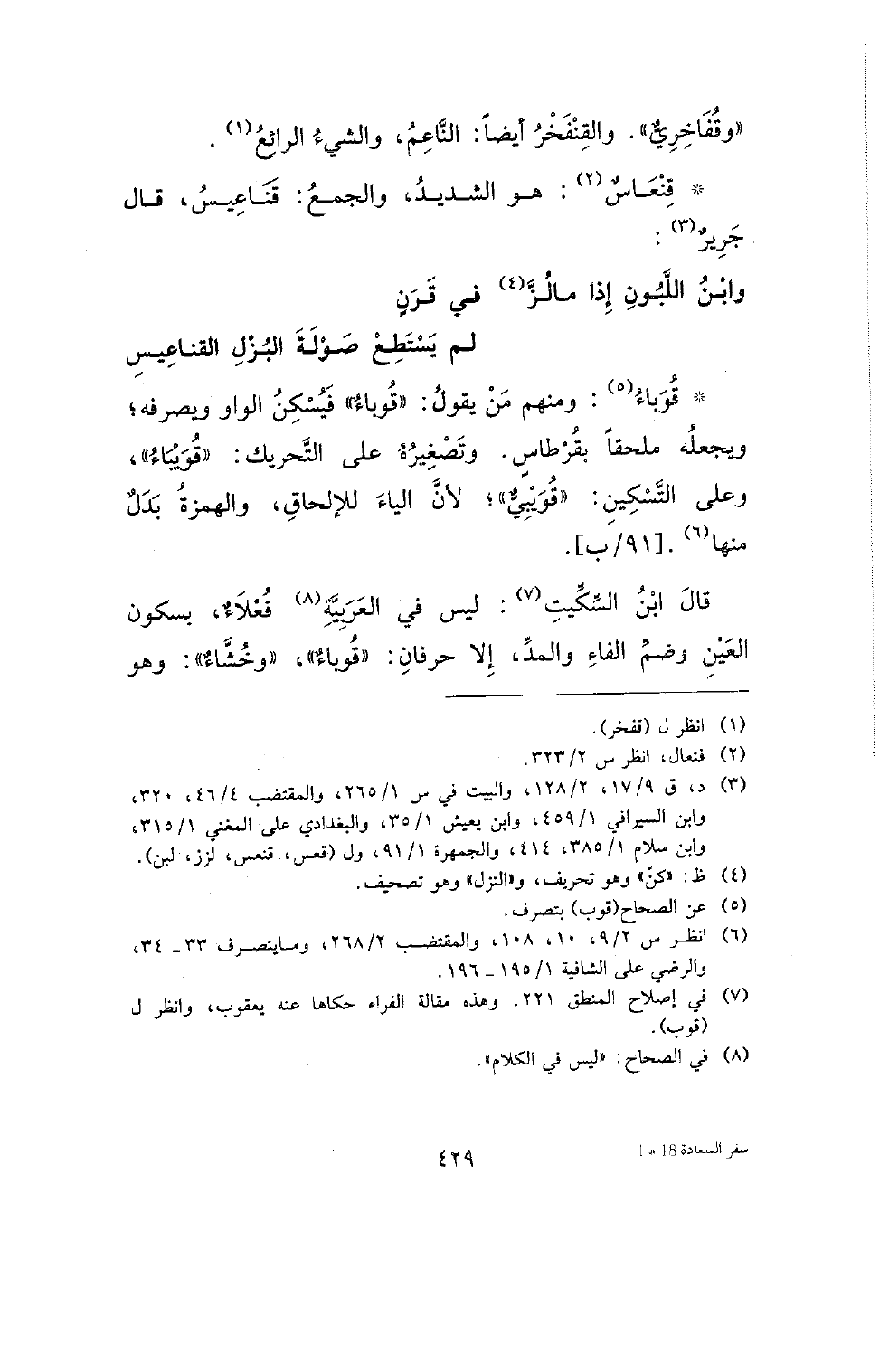 * قوباء: ومنهم من يقول: (قوباء) فيسكن الواو ويصرفه؛ ويجعله ملحقا بقرطاس. وتصغيره على التحريك: (قويباء)، وعلى التسكين: (قويبي)؛ لأن الياء للإلحاق، والهمزة بدل منها. [91/ب].