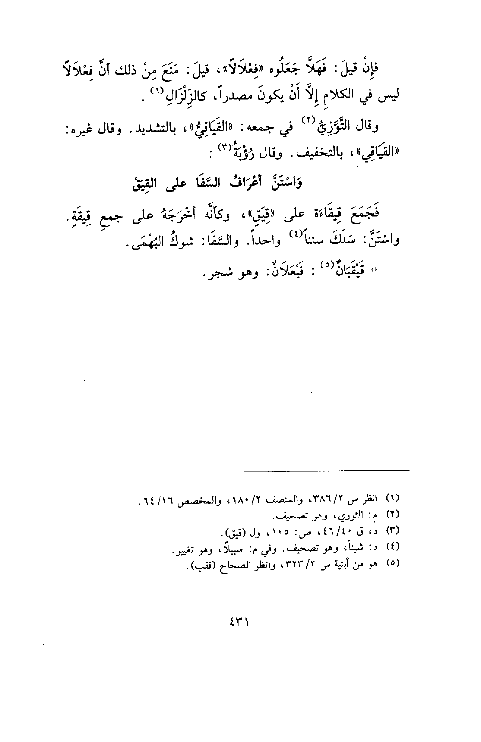 وقال التوزي في جمعه: (القياقي)، بالتشديد. وقال غيره: (القياقي)، بالتخفيف. وقال رؤبة: