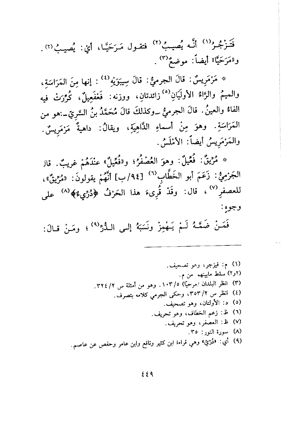 * مريق: فعيل: وهو العصفر؛ و (فعيل) عندهم غريب. قال الجرمي: زعم أبو الخطاب [49/ب] أنهم يقولون: (مريق)، للعصفر، قال: وقد قرئ هذا الحرف {دريء} على وجوه: