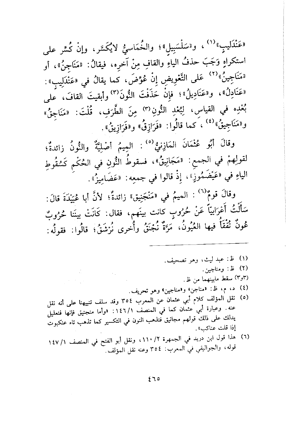 (عندليب) و (سلسبيل)؛ والخماسي لا يكسر، وإن كسر على استكراه وجب حذف الياء والقاف من آخره، فيقال: (مناجن)، أو (مناجين) على التعويض إن عوض؛ كما يقال في: (عندليب): (عنادل)، و (عناديل)؛ فإن حذفت النون وأبقيت القاف، على بعده في القياس، لبعد النون من الطرف، قلت: (مناجق) و (مناجيق)، كما قالوا: (فرازق) و (فرازيق).