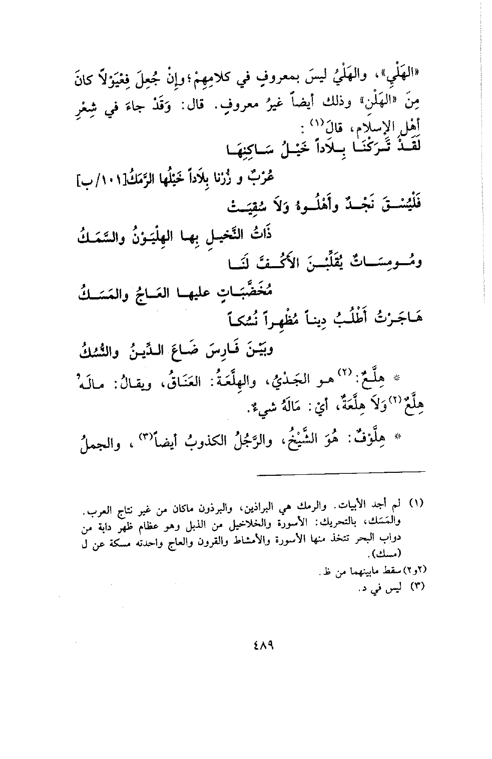 (الهلي)، والهلي ليس بمعروف في كلامهم؛ وإن جعل فعيولا كان من (الهلن) وذلك أيضا غير معروف. قال: وقد جاء في شعر أهل الإسلام، قال: